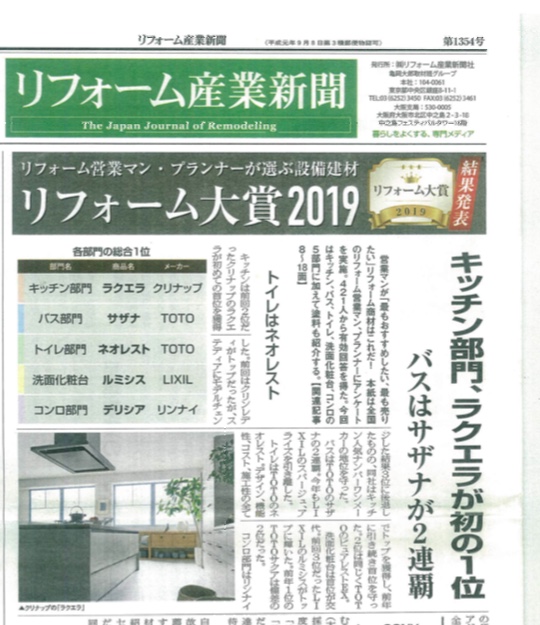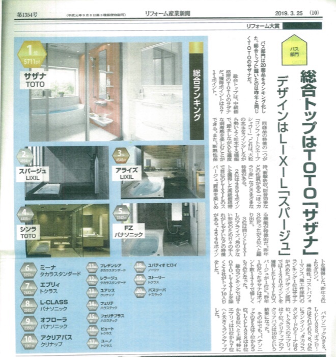 リフォーム業界ではリフォーム新聞というものが発行されています。その中で年に1回全てのメーカー商品の中でお風呂のNo1を決める企画があるのです。(リフォーム業者による投票です。)