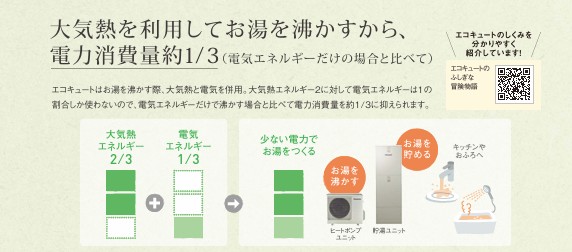 エアコンや冷蔵庫にも使われている「ヒートポンプ技術」を応用しており、外の空気から熱を取り込み、その熱を冷媒によって圧縮・膨張させることで、お湯を温めています。この仕組みにより、投入した電気エネルギーの何倍もの熱エネルギーを生み出すことが可能になるのです。